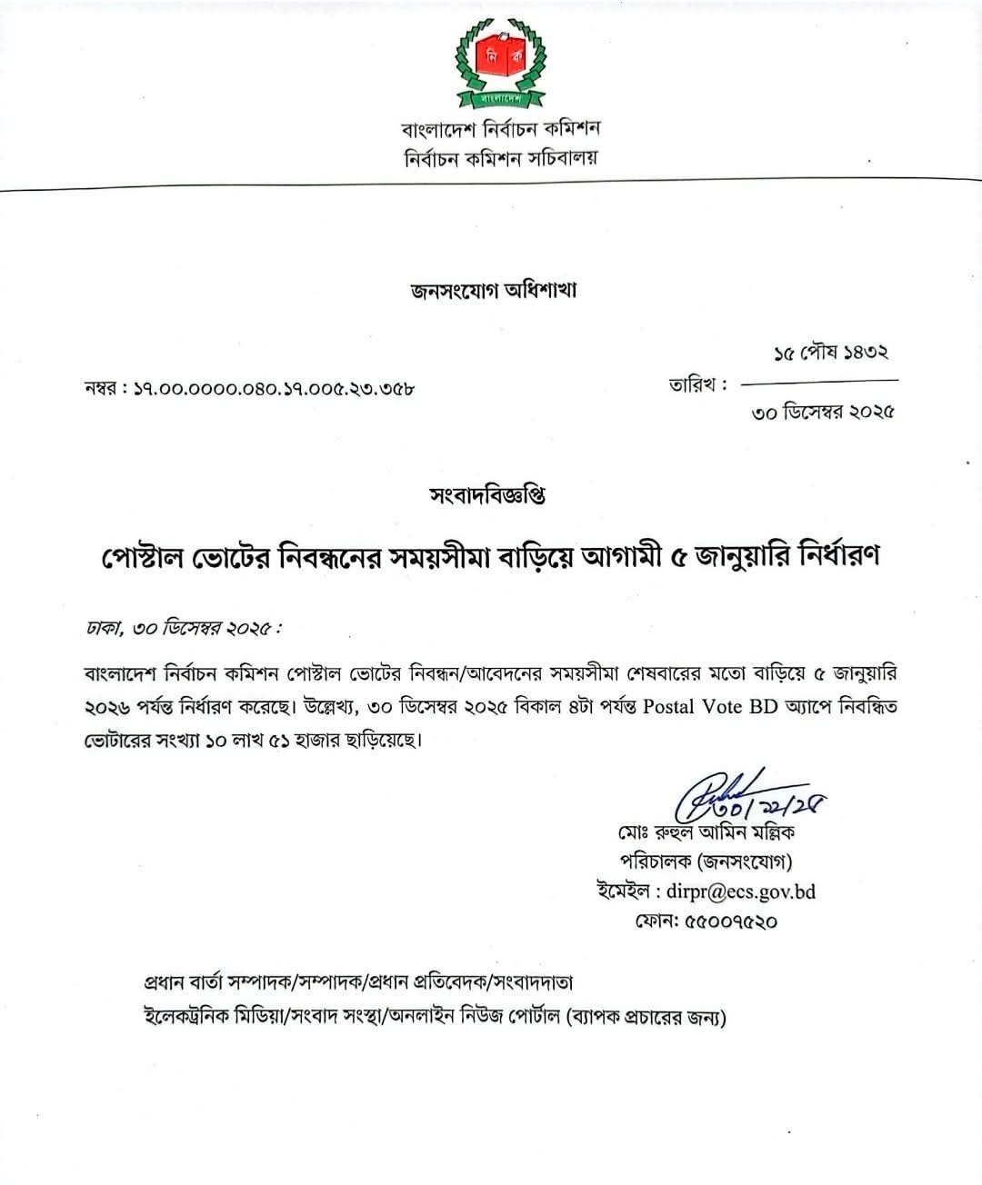 অদ্য ০৫/০১/২০২৬ খ্রিঃ রোজ সোম বারের মধ্যে পোষ্টাল ভোটের নিবন্ধনের সময়সীমা আছে, তাই সকল সরকারি চাকরিজীবীদের আজই পোষ্টাল ভোটের নিবন্ধন করার জন্য অনুরোধ করা হলো